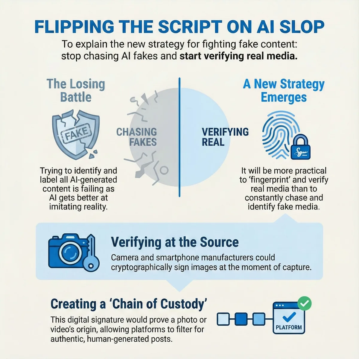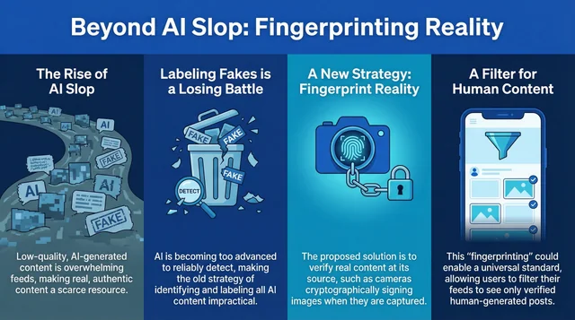 This paper argues that while Mosseri's proposal to "fingerprint" reality is a necessary technical foundation, it functions as a strategic misdirection from the platforms' own complicity in creating the crisis. A sustainable solution cannot be merely technical; it requires a fundamental realignment of algorithmic and economic incentives to prioritize irreducible human originality over infinitely reproducible AI content.