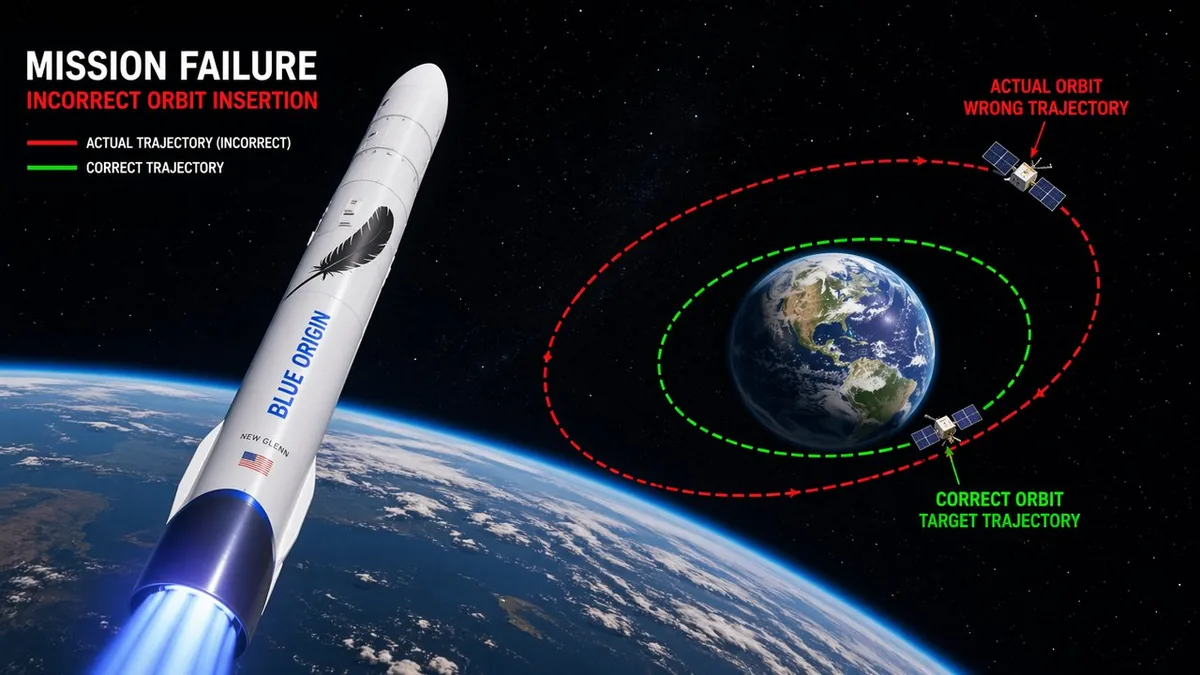 Mission data confirmed New Glenn delivered its payload to a different orbital altitude and inclination than target parameters. This type of orbit insertion anomaly typically results from upper stage engine performance variance, guidance system error, or fuel management issues during the final burn.