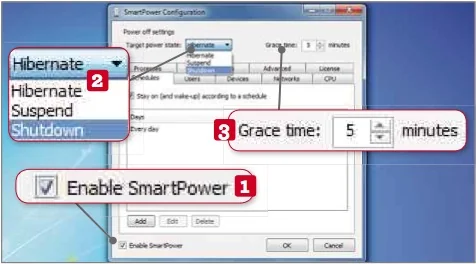 1.?With the Enable SmartPower box ticked, 1 your PC will try to power down unless one of the rules you?re about to set up stops it. Choose whether it should Hibernate, Suspend or Shutdown from the drop-down menu. 2 ?Grace time? 3 delays the shut down by the length of time you set.