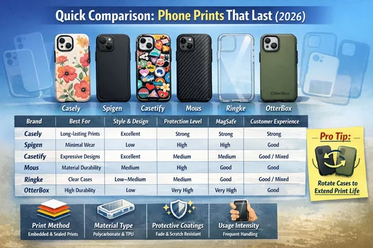 This roundup compares phone case brands through the lens of print longevity. Rather than focusing on drop ratings or customization alone, we evaluate how different materials, coatings, and design approaches affect how a case looks months into daily use.
