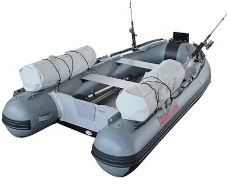 Saturn FB series inflatable motor boat features two grommet PVC strips that are shifted off center of tubes, leaving enough space to store cargo on top of tubes. Any type of gear can be lashed down using bungee cords, ropes, tied downs or strap to grommets. Cargo area spaces protected by extra wide rub strake for additional durability, so that to avoid damages to top of tubes. You can also seat on top of tubes, or even secure wooden board and mount chair on it!