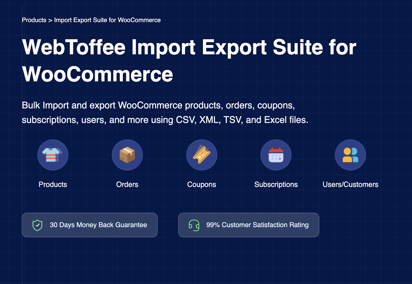 For stores that rely on routine updates, automated scheduling through FTP or SFTP keeps imports and exports running in the background. This helps prevent delays, improve accuracy, and maintain smooth day-to-day operations. The suite brings together capabilities found in WebToffee’s Product Import Export for WooCommerce, Order Import Export for WooCommerce, and User Import Export for WooCommerce, giving you a unified and efficient system for managing store data at scale.