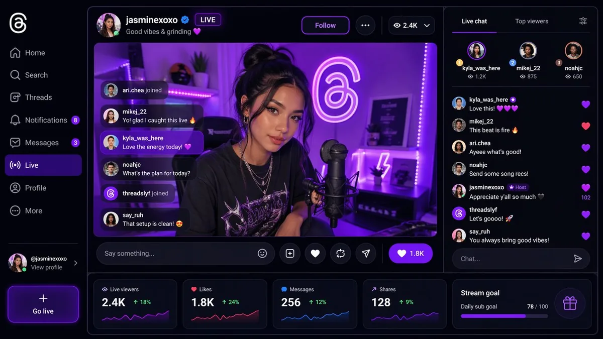 Threads' Live Chat feature allows creators and public figures to host live group conversations, with followers able to join, comment, and interact in real time. The feature is designed to drive the kind of "must be there now" engagement that makes social platforms sticky — the feeling that something is happening live and you're missing it if you're not watching.